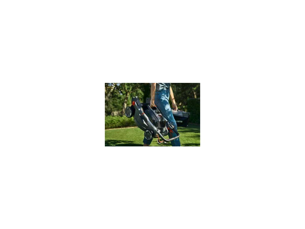 Vertikálne uloženie - Jednoducho zložte rukoväť, aby ste minimalizovali priestor na skladovanie a prepravu. Skladujte výrobok na stene/koľajnici alebo zvisle na podlahe. Zberný kôš na trávu je možné na stroji prehľadne uložiť.