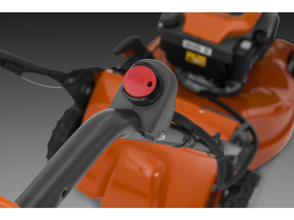 Kosačku spustíte stlačením štartovacieho tlačidla a ovládacej páky prítomnosti obsluhy. Na zastavenie motora stačí uvoľniť páku prítomnosti obsluhy. Vďaka tomu je manipulácia bezpečná a nenáročná, čím sa minimalizuje riziko náhodného spustenia a prevádzky bez dozoru.