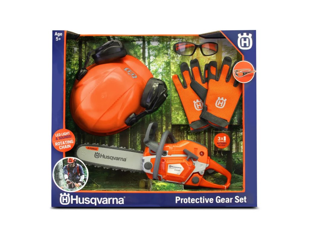 Vyzerá ako skutočná reťazová píla Husqvarna 550XP. Plastová reťaz sa otáča a píla vydáva autentický zvuk reťazovej píly. Súprava obsahuje ochranné pomôcky pre deti. Hračka je vhodná pre deti od 3 rokov.